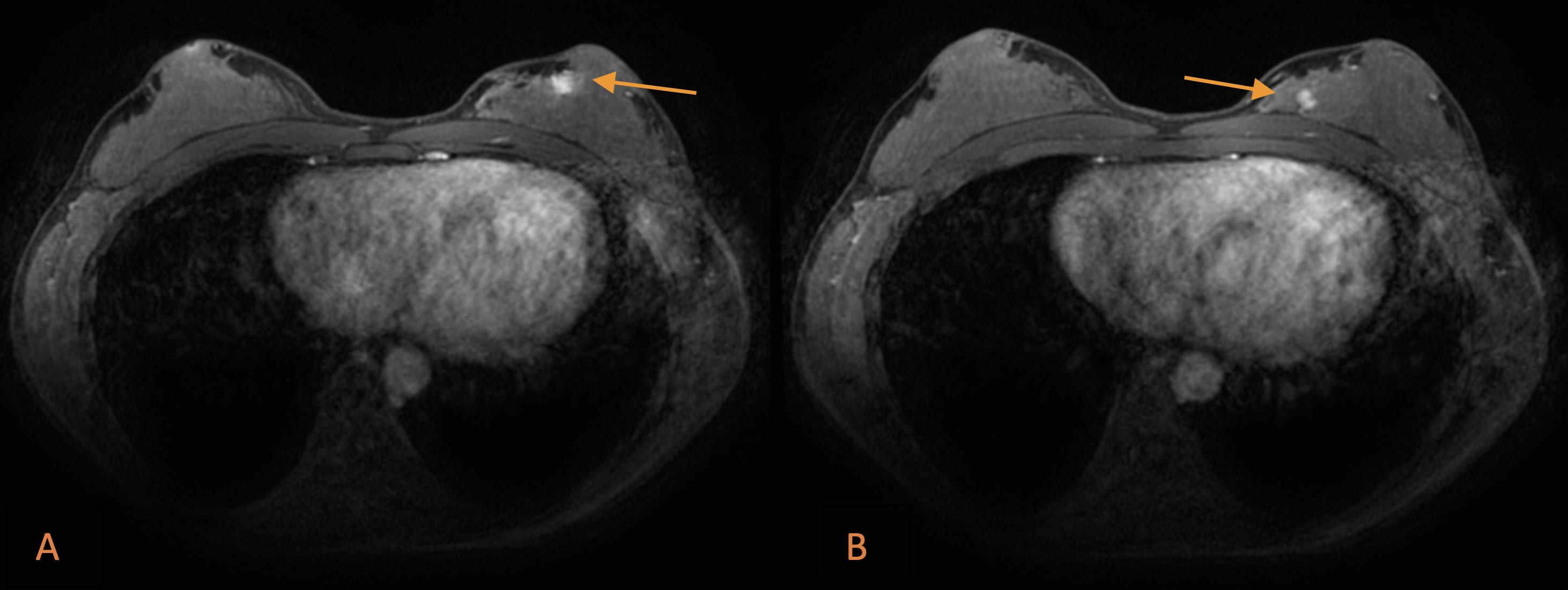 Figure 2: Breast MRI: T1-weighted fat-suppressed, contrast-enhanced sequences revealing the infracentimetric lesion initially detected by ultrasound, enhancing in the periareolar region (arrow in A). An additional 6 mm nodular lesion in the same breast quadrant was detected (arrow in B).