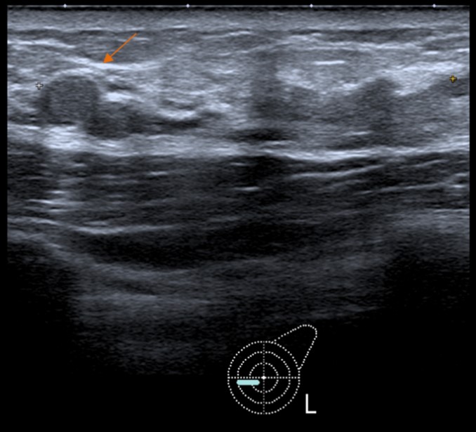 Figure 3: Second-look ultrasound depicting the additional lesion as a round nodule - core needle biopsy also revealed MEC of the breast.