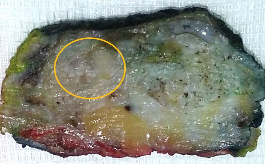 Figure 4: Surgical specimen: a poorly defined greyish nodule with 1cm (circle) was seen at gross section in a background of dense breast tissue.