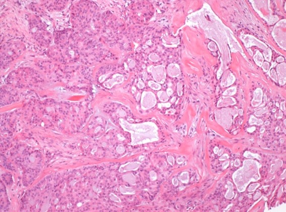 Figure 5: Microscopic sections showed a tumor with cribriform/microacinar architecture in a background of stromal sclerosis. The majority of cells showed round nuclei and abundant eosinophilic cytoplasm. Peripherally, cells with small uniform nuclei and dense cytoplasm were seen. Presence of extracellular and intracytoplasmic mucin was observed. (HE, x100).