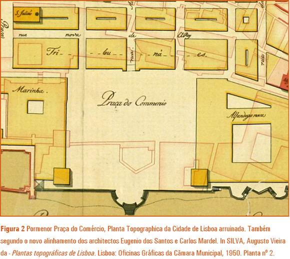 4 Assim o indica a Planta Topographica da Cidade de Lisboa arruinada. Tambem segundo o novo alinhamento dos architectos Eugenio dos Santos e Carlos Mardel, que inclui a legenda «Tribunaes» por sobre o desenho dos referidos edifícios. SILVA, Augusto Vieira da Plantas topográficas de Lisboa. Lisboa: Oficinas Gráficas da Câmara Municipal, 1950. Planta nº 2.