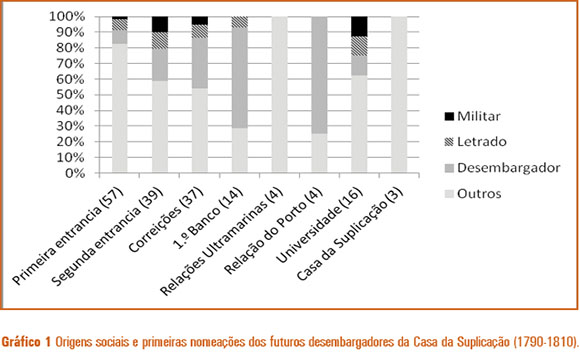 Uma consequência da existência de perfis que eram, à partida, privilegiados, é uma certa distorção, em seu favor, dos percursos. Se cruzarmos o perfil familiar do futuro desembargador da Casa da Suplicação com a categoria do ofício que recebeu na sua primeira nomeação (Gráfico 1), verificamos que o peso dos familiares de outros ministros é maior quando a nomeação é para lugares de maior importância, sobretudo para aqueles que antecedem o estatuto de desembargador ou, até, diretamente para desembargador da Relação do Porto. Paradigmático, é o seu peso relativo entre os que começam a carreira em lugares chamados de primeiro banco (lugares que, pela importância da jurisdição onde eram servidos, possibilitavam o acesso ao estatuto de desembargador findo o serviço): dos catorze futuros desembargadores da Casa da Suplicação que começaram a sua carreira por um lugar de primeiro banco, nove pertenciam a famílias de ministros letrados. De igual modo, três em quatro dos indivíduos que começam com nomeações para a Relação do Porto (sem serem lentes da universidade), pertencem a dinastias de desembargadores.