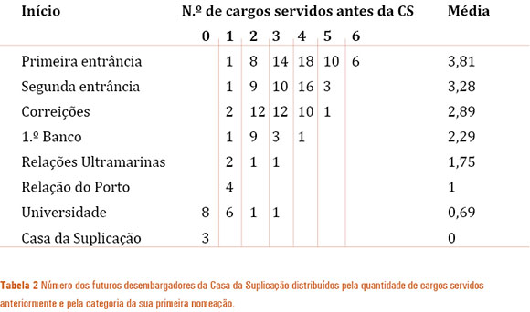 Dependendo do primeiro passo na carreira, os magistrados que viriam a aceder à Casa da Suplicação serviriam mais ou menos lugares. A média global para os que serviram no tribunal entre 1790 e 1810 era de 3 lugares mas os percursos seriam muito diferentes consoante o seu início. A Tabela 2 mostra a totalidade dos casos. Observamos como um magistrado que servisse a sua primeira nomeação num lugar de escalão mais baixo necessitaria em média de quase 4 lugares para chegar ao tribunal lisboeta enquanto que os que iniciavam a carreira por um lugar de primeiro banco precisavam de pouco mais de 2. Não eram incomuns os percursos com 5 lugares desempenhados, enquanto que os percursos com um lugar apenas dizem respeito, na sua maioria, a entradas pelos lugares mais altos da carreira.