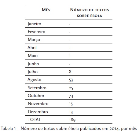 Consideramos também importante mencionar ter sido possível observar no levantamento efetuado que os textos sobre o ébola tinham predominantemente um caráter mais noticioso do que opinativo. Podemos ilustrar essa informação recorrendo a um olhar mais quantitativo: nos 189 textos identificados entre janeiro e dezembro de 2014, somente 18 eram de géneros textuais jornalísticos mais opinativos - estando estes distribuídos entre: editoriais, cartas de leitores ou artigos assinados. Logo, os demais textos apresentados, de caráter mais informativo – totalizando 170 textos – foram apresentados em formato de notas, notícias ou reportagens, sendo alguns deles acompanhados de ilustrações, infográficos ou fotografias sobre o tema. O mês de outubro foi expressivamente o mês com maior publicação de textos sobre o assunto.