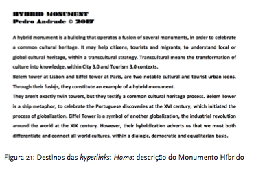 Sinopse: esta obra de arte organiza conteúdos e conhecimento sobre Lisboa e o turismo nesta cidade, por meio de textos, imagens e sites sócio-semânticos no interior da Web 3.0. Ao entrar na aplicação, o utilizador pode escolher entre as seguintes links: Home: introdução ao contéudo exposto; About: CV do autor; Gallery: exposição virtual de imagens do Monumento Híbrido; outros links conduzem aos sites social-semânticos Experimental Books e Web 3 Novel, onde se encontram diversos conteúdos sobre a cidade, a cultura e o turismo. O Monumento Híbrido significa uma fusão entre a Torre de Belém em Lisboa e a Torre Eiffel, o que opera uma articulação entre patrimónios culturais diversos. Aqui, é consultável através de um dispositivo de realidade aumentada. O visitante da Galeria Sociológica Virtual experimenta uma inédita e seminal mistura entre as realidades social, virtual, aumentada e mista, um processo que produz a realidade híbrida.