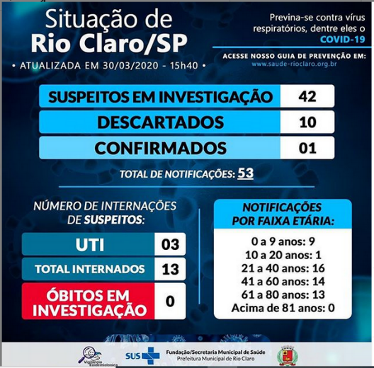 Fonte. Retirado de Situação de Rio Claro atualizada via informação da Vigilância Epidemiológica em 30.03.2020, 15h40 [Fotografia], por Fundação Municipal de Saúde [@fmsrioclaro], 2020a, Instagram. (https://www.instagram.com/p/B-XtkJ0H0P5/)
