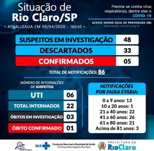 Fonte. Retirado de Aviso Situação de Rio Claro atualizada via informação da Vigilância Epidemiológica em *09.04.2020, 16h30* [Fotografia], por Fundação Municipal de Saúde [@fmsrioclaro], 2020b, Instagram. (https://www.instagram.com/p/B-xl_L0nxbw/)