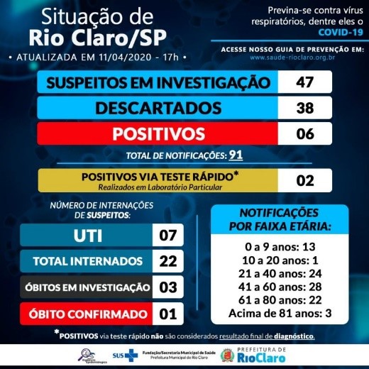 Fonte. Retirado de Alerta Situação de Rio Claro atualizada via informação da Vigilância Epidemiológica em 11.04.2020, 17h. *Os casos POSITIVOS VIA TESTE RÁPIDO (Laboratório Particular) não são considerados resultados finais de diagnóstico* [Fotografia], por Fundação Municipal de Saúde [@fmsrioclaro], 2020c, Instagram. (https://www.instagram.com/p/B-2rG8unplh/)