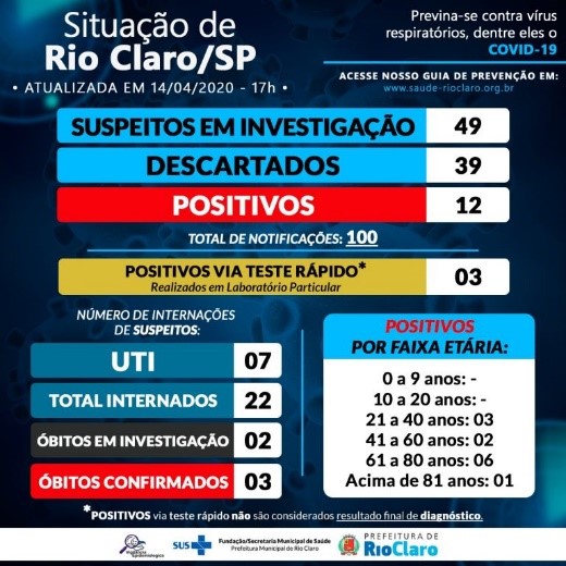 Fonte. Retirado de Alerta Situação de Rio Claro atualizada via informação da Vigilância Epidemiológica em 14.04.2020, 17h [Fotografia], por Fundação Municipal de Saúde [@fmsrioclaro], 2020d, Instagram. (https://www.instagram.com/p/B--dA03HAIV/)