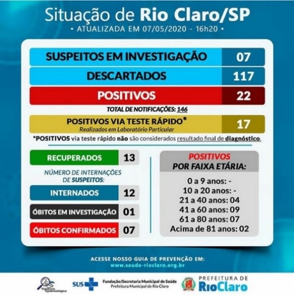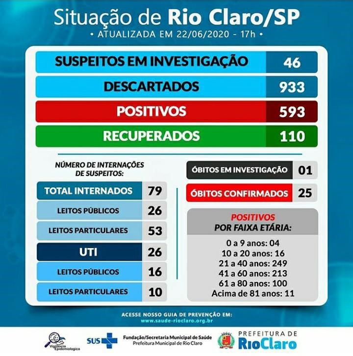 Fonte. Retirado de Alerta Situação de Rio Claro atualizada via informação da Vigilância Epidemiológica em 22.06.20, 17h [Fotografia], por Fundação Municipal de Saúde [@fmsrioclaro], 2020g, Instagram. (https://www.instagram.com/p/CBwK6jmH6o4/)