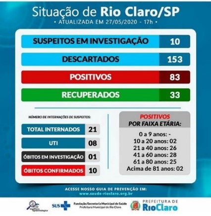 Fonte. Retirado de Alerta Situação de Rio Claro atualizada via informação da Vigilância Epidemiológica em 27.05.2030, 17h [Fotografia], por Fundação Municipal de Saúde [@fmsrioclaro], 2020f, Instagram. (https://www.instagram.com/p/CAtJXRuHaP3/)