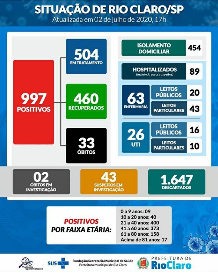 Fonte. Retirado de Alerta Situação de Rio Claro atualizada via informação da Vigilância Epidemiológica em 02.07.20, 17h [Fotografia], por Fundação Municipal de Saúde [@fmsrioclaro], 2020h, Instagram. (https://www.instagram.com/p/CCJ3GibHiQd/)