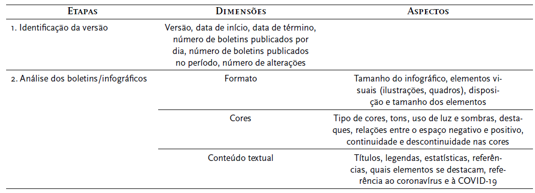 A primeira etapa constou da análise individual de cada infográfico. Em seguida, dentro do conjunto de cada versão, o material foi analisado focalizando: o período e a frequência de publicação, o formato, as cores e conteúdos escritos. Em cada uma dessas dimensões vários aspectos foram observados, como indica o quadro abaixo (Tabela 1), sem perder a visão de que dentro dos infográficos essas dimensões estão intimamente articuladas, bem como que as três versões são um continuum.