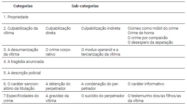 Numa lógica de triangulação e complementaridade dos dados, a análise do conteúdo das peças noticiosas comporta uma análise quantitativa, operacionalizada a partir de análises descritivas simples de variáveis previamente assinaladas e uma análise qualitativa, com recurso à análise de conteúdo categorial, com vista a uma maior amplitude e compreensão do fenómeno. Nesta última, procedeu-se à análise dos elementos da titulação das peças noticiosas, por forma a perceber quais os elementos do crime valorizados e se estes comportam a culpabilização direta ou indireta da vítima. Considerando a natureza dos dados, optou-se por uma análise de conteúdo categorial. Desta forma, passando pelo crivo de uma pré-análise e codificação, procedeu-se à criação de categorias significativas, a partir da significação dos elementos constitutivos da mensagem (Bardin, 2010). A mesma análise foi realizada para as reações sociais ao crime, através de citações diretas ou indiretas a partir das peças noticiosas, recolhidas junto da comunidade de pertença de vítima e perpetrador, por forma a perceber o seu papel na prevenção, ou não, do crime.