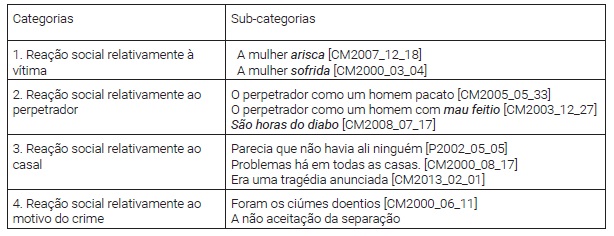 Por forma a perceber qual o papel da comunidade na prevenção, ou não, do crime, em que vítima e protagonista estão ou estiveram inseridos, realizou-se uma análise de conteúdo categorial às reações sociais ao crime e aos seus protagonistas, cujas categorias são vertidas na tabela infra.