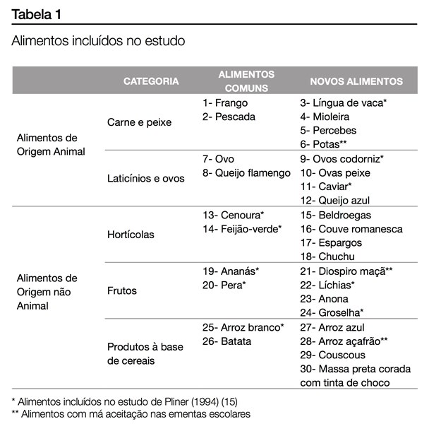 Os alimentos estavam distribuídos por 5 categorias. De cada categoria constavam 6 alimentos, dos quais 2 correspondiam a alimentos comumente utilizados na gastronomia da região (“alimentos comuns”) e 4 a alimentos pouco comuns (“novos alimentos”; NA). Os alimentos escolhidos, sobretudo os NA, tiveram por base o estudo de Pliner (1994) (15) e a identificação de alimentos constantes das ementas escolares mais rejeitados pelas crianças (através da análise dos registos semanais do Serviço de Acompanhamento de Refeições Escolares referentes às semanas anteriores à da recolha de dados) e a lista foi completada de modo a assegurar variedade de alimentos (Tabela 1).