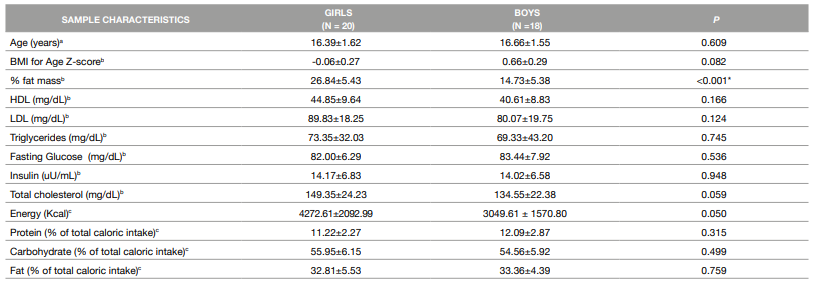 Thirty-eight participants (20 girls) were included in the study. The mean (± SD) age of the boys and girls was 16.66 ± 1.55 and 22.61 ± 4.09 years, respectively, and their mean BMI was 21.23 ± 3.7 and