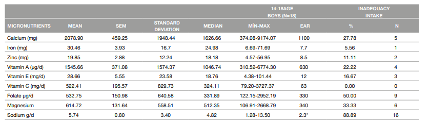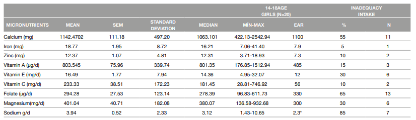 There were no statistically significant differences between the sexes with regard to intake of carbohydrates, protein, and lipids. The mean macronutrient intake values were within normal limits for adolescents. However, energy consumption was 1223 kcal higher in boys than in girls (p = 0.050) (Table 1). When analyzing micronutrient intake, boys exhibited a higher intake of calcium (p = 0.034), iron (p = 0.013), zinc (p = 0.026), vitamin E (p = 0.047), and sodium (p = 0.047) compared with girls. After adjusting for BMI, differences between the sexes in calcium (p=0.044), iron (p=0.018), and zinc (p=0.028) intake remained significant (Table 2). Considering nutrient intake inadequacies, in boys, the consumption of sodium was higher than the UL in 88.89%, and folate and magnesium intake were inadequate in 50% and 33.33%, respectively (Table 3). In girls, sodium intake was higher than the UL in 85%, and intake of folate and calcium were inadequate (65% and 55%, respectively) (Table 4).