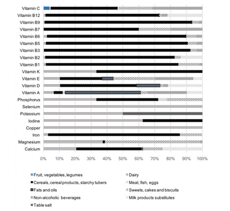 Statistical analyses were performed using Microsoft 365® - Excel®. For each IAN-AF 2015-2016 food group, the group determined the relative frequency of M-FF and the distribution of fortified foods. The number of foods fortified in each micronutrient individually considered and the prevalence of the different profiles of micronutrient fortification was analyzed. The distribution of micronutrient addition across the different IAN-AF 2015-2016 food groups was also assessed.