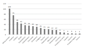 Ao final do período de coleta obteve-se um total de 151 questionários respondidos, todos por praticantes de musculação. A média de idade foi de 30,6 ± 8,86 anos (18 - 64 anos). O perfil (Tabela 1) apresenta maioria de mulher (53%), solteira (57%), sem filhos (61,6%), com 12 ou mais anos de estudo (77,5%), trabalhando (44,4%) e com renda familiar de 4 ou mais salários mínimos (66,2%). Acerca da saúde e hábitos de vida a maioria relatou não possuir nenhum tipo de doença (93,4%) não utilizar medicação (82,8%), se preocupa com a alimentação (89,4%), realiza quatro ou mais refeições por dia (72,2%), pratica exercício com objetivo de melhorar o corpo (55,6%), não fuma (90,1%) e ingere bebida alcoólica (51%). Quando avaliada a utilização de suplementos alimentares a maioria (n = 88) declarou que utiliza ao menos um suplemento, seguido por não utiliza (n = 37) e não utiliza no momento, mas já utilizou (n = 26). Considerando a utilização por 75% (n = 114) dos participantes que relataram fazer ou já ter feito o uso de ao menos uma substância, ocorreu prevalência do sexo masculino de 53,5% (n = 61), mostrando que mesmo tendo predominância feminina de participação, os homens são mais propensos a utilizar suplementos alimentares. Na presente pesquisa os suplementos alimentares utilizados pelos participantes da pesquisa foram whey protein (n = 100), creatina (n = 75), cafeína (n = 48), BCAA (n = 42). O Gráfico 1 apresenta todos os produtos listados pelos participantes da pesquisa, sendo que o carboidrato está unificado (maltodextrina n = 15; dextrose n = 09; D-ribose n = 04; palatinose n = 04 e waxy maize n = 02)