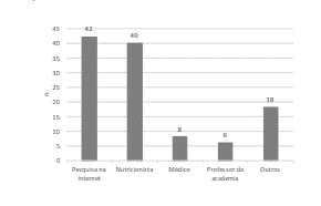 A maioria busca com a suplementação melhorar a saúde (n = 45), seguido por hipertrofia (n = 27), complementação da alimentação (n = 18), perda de peso (n = 13), performance (n = 7) e ganho de força (n = 4), entretanto, foram encontradas associações significativas apenas para o sexo, estado civil, ocupação, renda, preocupação com alimentação e número de refeições consumidas (Tabela 2). Sobre a indicação e/ou prescrição dos produtos (Gráfico 2), a maioria dos participantes (57,9%) utiliza os produtos sem orientação profissional adequada (nutricionista e/ou médico). A maioria reportou ter adquirido os produtos após pesquisa por conta própria na internet (n = 42), seguido da prescrição por nutricionista (n = 40) e afirmou perceção parcial de resultados com a utilização dos suplementos alimentares (n = 60), seguido por percepção total (n = 45), não observou resultado (n = 7) e dois participantes não recordavam. Foi encontrada associação entre eficácia e prescrição por nutricionista (x² = 41,564; p < 0,001) e ausência de efeito colateral e prescrição por nutricionista (x² = 35,636; p < 0,001), ou seja, dos 40 participantes que utilizaram com prescrição realizada por nutricionista, todos encontraram efeitos satisfatórios (n = 18) ou parcialmente satisfatórios (n = 22), e apenas um reportou perceção de efeitos colaterais. Para as demais fontes prescritoras ou indicadoras não foram encontradas associações significativas.