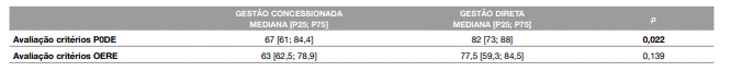 Tabela 2: Percentagem de cumprimento global dos critérios P0DE e OERE entre diferentes modelos de gestão