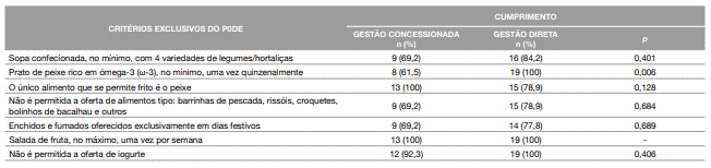 Os refeitórios com gestão direta cumpriram uma maior percentagem (82%), em mediana, de critérios P0DE, relativamente aos de gestão concessionada (p = 0,022) (Tabela 2). Os refeitórios de gestão direta cumpriram a periodicidade exigida de oferta de peixe rico em ω3 (p = 0,006). O critério referente à disponibilidade de salada de fruta foi cumprido pela totalidade dos refeitórios e o relativo à oferta de iogurte apenas não foi cumprido por um (Tabela 3). Os critérios alusivos ao prato de peixe rico em ω3 e à proibição de alimentos tipo barrinhas de pescada, rissóis, croquetes e outros, relacionam-se com a avaliação dos critérios P0DE (p = 0,010 e 0,008, respetivamente) (Tabela 4).