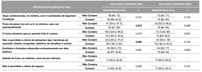 Os critérios alusivos ao prato de peixe rico em ω-3 e o que proíbe a oferta de alimentos tipo barrinhas de pescada, rissóis, croquetes, bolinhos de bacalhau, são os que mais influenciam positivamente a avaliação dos critérios P0DE. Tal poderá estar associado à escolha de peixe gordo para cumprir a periodicidade exigida de oferta de peixe e à facilidade com que as escolas eliminam os produtos alimentares proibidos.