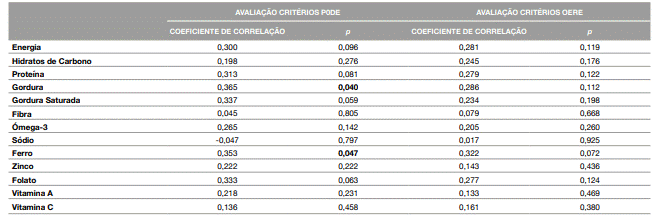 Tabela 6: Correlação entre a percentagem de cumprimento de nutrientes e energia e avaliação dos critérios P0DE e OERE