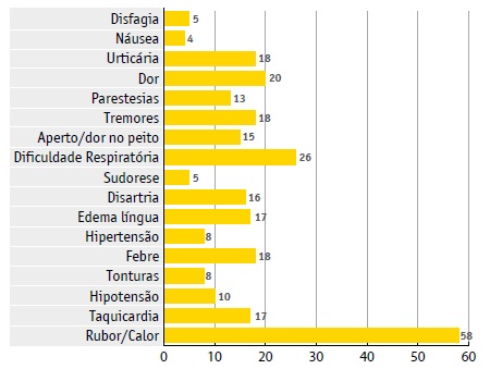 Constatámos que as RI ocorreram maioritariamente nos primeiros 30 minutos após o início da infusão do fármaco antineoplásico (52%). A maioria das RI ocorreu no 1º ciclo de tratamento (31,2%, n = 46), nomeadamente com taxanos, tendo as reações com sais de platino ocorrido mais frequentemente entre o 8º e 11º ciclos. As RI foram também mais comuns com esquemas de poliquimioterapia (80%). Segundo a ESMO a maioria dos tratamentos tem sempre associado o risco de reações infusionais e esse risco aumenta se tivermos vários agentes quimioterápicos a ser administrados concomitantemente. Os registos de sintomas mais comuns foram mucocutâneos (29%, n = 42), principalmente rubor facial, eritema, urticária e prurido localizado e generalizado (Figura 1).
