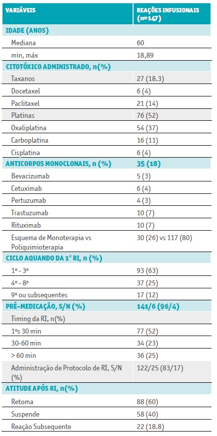 No geral, as RI foram precocemente reconhecidas e o protocolo institucional (PI) foi seguido na sua totalidade em 83% (n = 122) dos casos. O tratamento foi retomado em 60% (n = 88) logo após os eventos ocorridos e foi reconduzido para dias posteriores em 68% (n = 100) após intensificação da pré-medicação ou com protocolo de dessensibilização ao fármaco ou encaminhamento para a consulta de imunoalergologia.