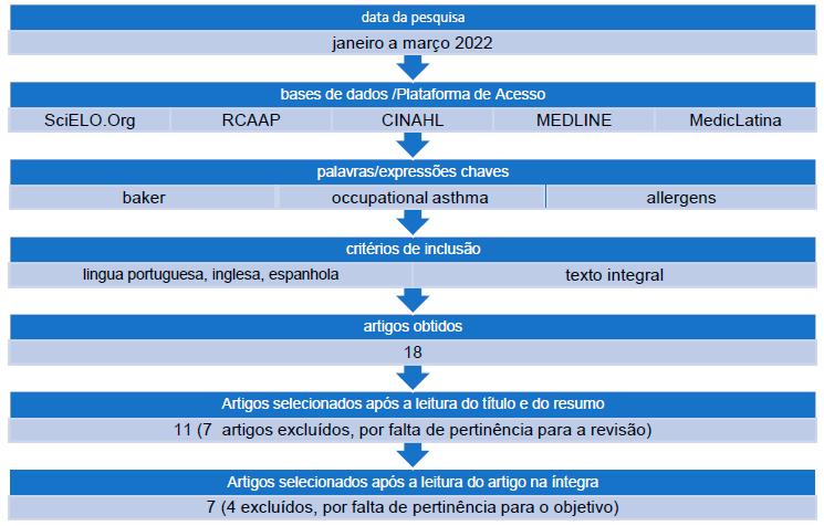 Deste modo, a pesquisa incluiu como palavras-chave os termos “baker”, “occupational asthma” e “allergens”. Seguidamente, foram utilizadas combinações de descritores através do operador boleano AND, resultando a seguinte expressão de pesquisa: (occupational asthma AND alllergens AND baker). Como critérios de inclusão foram considerados os artigos disponíveis em texto integral publicados nos últimos cinco anos, em inglês, português e/ou espanhol.