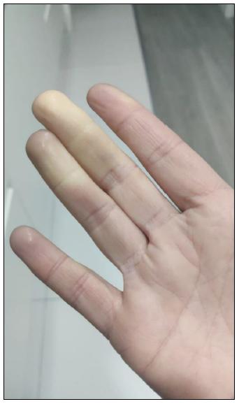 Trata-se de uma mulher de 40 anos, enfermeira instrumentista há 15 anos num Hospital Central solicitou exame ocasional de Medicina do Trabalho por queixas de aparecimento de fenómenos de Raynaud no bloco operatório. A sintomatologia tinha surgido há cinco meses, com afetação do segundo e terceiro dedo da mão esquerda e da mão direita, respetivamente (ver anexo 1).