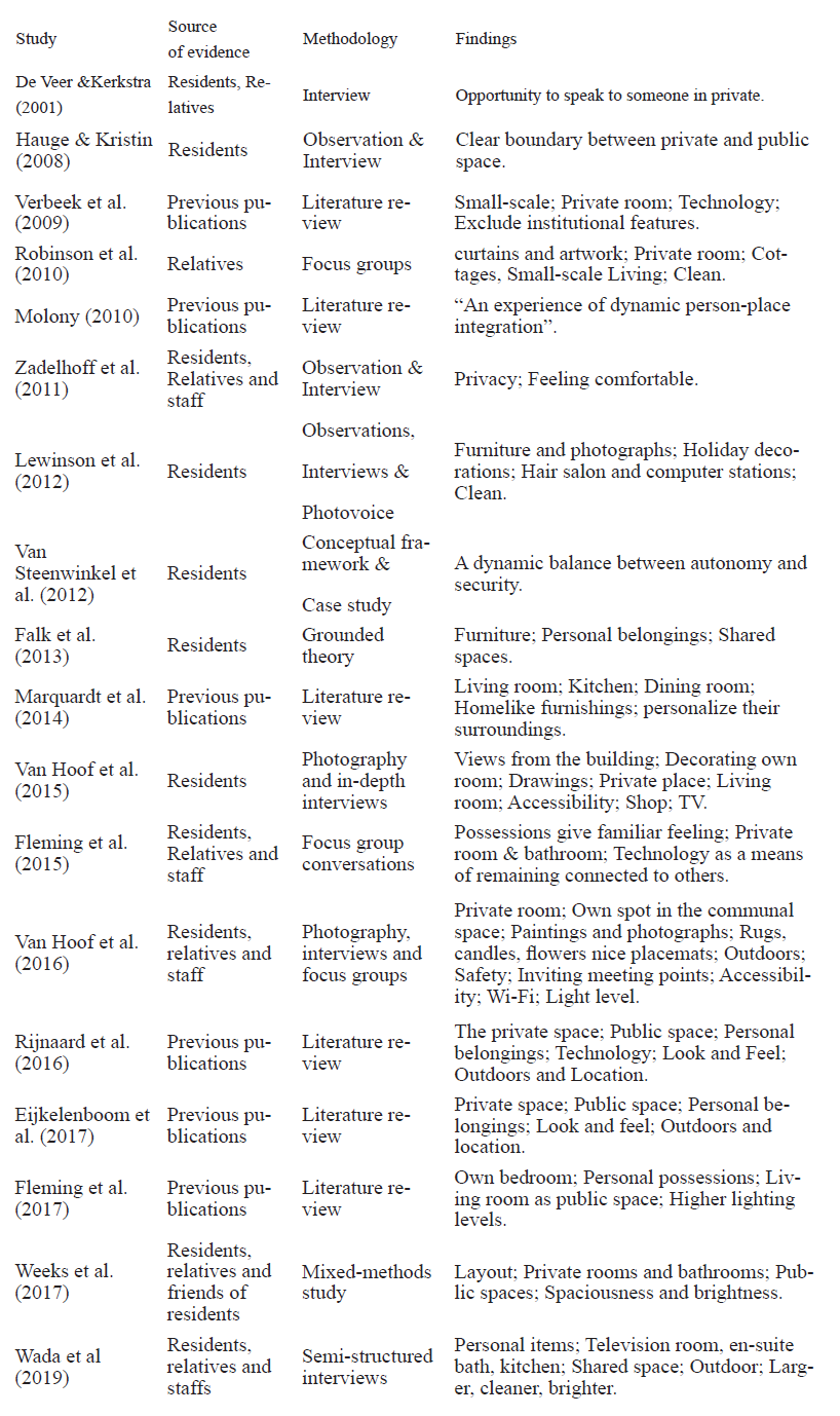 Concerning the research categories identified in this article, reviewed publications indicate that current studies follow the Evidence-focused Design (EBD) approach, defined as a design based on the best available evidence from credible research (Hamilton, 2007). According to this definition, 17 reviewed studies can be classified into the research-focused and only 1 represents a practice-focused study. The research-focused studies, which stands on the scientific field, tends to be more concerned with the analysis of physical environmental features. In contrast, the design-focused study, mainly develops specific design strategies for practice. Concerning methods, in the research-focused studies, the majority adopt qualitative research methods, such as observations and interviews, which collect the data from residents who live in care facilities, relatives, care staff, and then analysed qualitatively. Only 3 of them choose PWD as objects for observations and interviews (Hauge & Kristin, 2008; Lewinson et al., 2012; Van Hoof et al., 2015); 4 studies include information from relatives and nursing professionals (De Veer & Kerkstra, 2001; R. Fleming et al., 2015; Robinson et al., 2010; Van Zadelhoff et al., 2011). Due to cognitive impairments, 3 reviewed studies incorporate technical aids (photography, photovoice) into the observations and interviews by asking participants to operate a camera to capture scenes that make them feel at home (Lewinson et al., 2012; Van Hoof et al., 2015, 2016). In contrast to traditional observations and interviews, Falk et al. (2013) uses grounded theory method based on data which were gathered using face-to-face interviews. Another 4 studies provide a comprehensive analysis of the environmental factors that influence the feeling of home by a literature review (A. Fleming et al., 2017; Molony, 2010; Rijnaard et al., 2016; Verbeek et al., 2009). Furthermore, 1 study identifies a framework of essential elements influencing the feeling of home for PWD and explores related physical environment aspects based on the case study (Vansteenwinke et al., 2012). In addition to the qualitative approach described above, Weeks et al. (2017) use a mixed-methods approach: firstly, the participants completed a survey, and the preliminary results were used to guide the implementation of the focus groups. In all the reviewed literature, there is only 1 practice-focused study which discusses how to incorporate evidence from research-focused studies in developing design guidelines in practice. Specifically, Eijkelenboom et al. (2017) addressed a series of design strategies used to design a demonstration apartment. It proposes systematic design guidelines applied for different care environments, including entrance and adjacent spaces, living room, kitchen, bedroom and bathroom. Indeed, this article presents 3 types of findings related to: (1) tangible physical environment, (2) intangible environmental features, and (3) holistic concept. The first 2 aspects are almost in line with earlier findings by Rijnaard et al. (2016), and the third one has a different understanding of results.