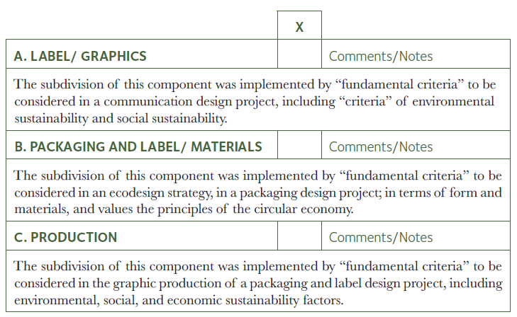 The sustainability criteria listed, were optimised to implement a specific project, packaging, and label design; having been organised as follows: