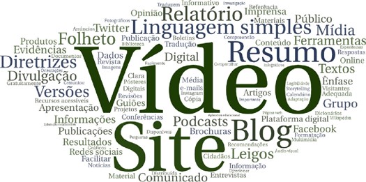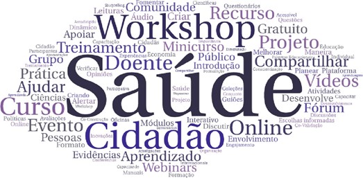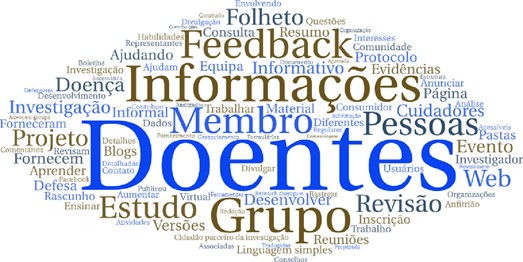 Conforme é possível identificar graficamente pela nuvem de palavras da Figura 1, a informação analisada denota que algumas entidades científicas envolvem o cidadão na comunicação de ciência a partir da formação de grupos, como por exemplo, grupo de doentes. Estas pessoas envolvidas, podem exercer o papel de representantes colaborando nas revisões de evidência, opinando sobre os materiais informativos que serão partilhados com a sociedade.