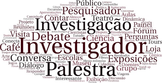 Na Figura 3, apresenta-se a nuvem de palavras que caracteriza as estratégias mencionadas. As entidades incluídas no estudo revelaram nas suas páginas de internet como promovem a comunicação de ciência, sendo clara a necessidade de aproximação dos investigadores aos cidadãos. Tal aproximação passa por atividades de interação, visitas a escolas, aulas abertas, reuniões e grupos de conversa. Inclui-se ainda a criação de momentos mais descontraídos e menos usuais, como exposições, espetáculos de teatro, visitas a museus e momentos de divulgação da ciência em cafés ou lojas.