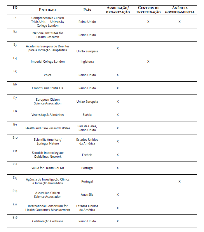 Foram analisadas por intencionalidade, as páginas de internet de entidades científicas internacionais com idoneidade e trabalho relevante no âmbito da CC, que cumprissem os seguintes critérios de inclusão: apresentar ou indicar ações ou iniciativas de comunicação de ciência para o cidadão nos seus separadores específicos da página e/ ou divulgação de projetos de investigação já desenvolvidos ou em curso, de acordo com o paradigma da CC.