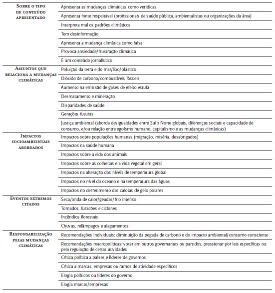 A classificação dos vídeos teve como base as categorias propostas por Basch et al. (2022) em estudo similar feito com o TikTok em inglês. No entanto, algumas adaptações foram realizadas no intuito de destacar algumas características dos vídeos e também de produzir uma adequação da análise à realidade brasileira. A tabela original apresenta 29 categorias a partir das quais os autores procuram observar aspectos como a apresentação das mudanças climáticas (se o problema é apresentado como algo real) e impactos ambientais e populacionais do fenômeno3. Em nosso estudo, dividimos as categorias em cinco macrocategorias de análise, a saber: “sobre o tipo de conteúdo apresentado”; “assuntos que relaciona a mudanças climáticas”; “impactos socioambientais abordados”; “eventos extremos citados”; e “responsabilização pelas mudanças climáticas”. As categorias dentro de cada macrocategoria estão apresentadas na Tabela 1. Duas subcategorias relativas a eventos mais comuns no Hemisfério Norte, “tornados” e “furacões”, foram mescladas. Além disso, acrescentamos a essa subcategoria o termo “ciclones”, relativo a eventos mais comuns no Brasil. Outras três subcategorias foram criadas para analisar aspectos específicos: “é um conteúdo jornalístico”, “desmatamento e mineração” e “chuvas, relâmpagos e alagamentos”.