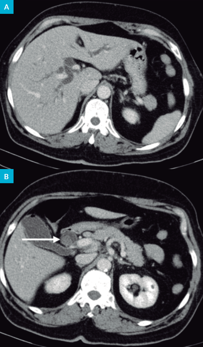 Tomografia computorizada (TC) abdominal: “Dilatação das vias biliares intra-hepáticas (VBIH) e da via biliar principal (VBP) de 18 mm, até ao segmento peri-pancreático/papila. Vesícula biliar em moderada repleção, com parede fina e sem sinais de litíase cálcica. Cálculo no colédoco? Adenomegálias hilares hepáticas e peri-pancreáticas. Fígado, pâncreas e baço sem alterações” (Fig. 1).