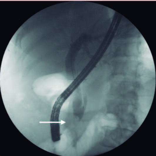 Análises após a CPRE (24/02/2020): leucócitos: 11,09×103 /μL; neutrófilos: 7,68×103 /µL; AST: 24 U/L; ALT: 43 U/L; bilirrubina total: 2,34 mg/dL; bilirrubina direta: 1,7 mg/dL; GGT: 468 U/L; FA: 329 U/L; CA 19.9: 576.6.