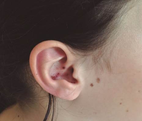 An 11-year-old girl presented to our emergency department with a 2-day history of nausea, vomiting and headache. She denied tinnitus, hipoacusia and vertigo. Her medical history included varicella infection at 5 years of age. Physical examination showed a right sided facial nerve palsy (House-Brackmann Facial Nerve Grading Scale (HB FGS) V). She had crusting vesicular lesions on the right ear pinna (Fig.s 1 and 2). Meningeal signs were negative. Computed tomography (CT) scan and blood analysis were unremarkable. Cerebrospinal fluid (CSF) showed an elevated white cell count (210 u/L) but normal glucose and protein levels. Based on clinical and analytical findings, Ramsay Hunt syndrome complicated with viral meningitis was diagnosed at this point. The patient started oral prednisolone (60 mg/day for 5 days), intravenous acyclovir (1500 mg/m2/day for 10 days) and physical rehabilitation. Subsequent molecular testing of CSF detected varicella zoster virus (VZV) RNA by reverse transcriptase PCR. The follow-up showed disappearance of the earache and vesicular rash, as well as the improvement of facial paralysis, becoming a grade III HBFGS. The one-year follow-up showed no relapse of the syndrome and total recuperation of the initial deficits (Fig. 3).