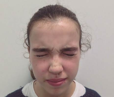 Figure 1: Deviation of the left lip commissure, incapacity for total occlusion of the right eye and asymmetry of the wrinkles in the forehead.