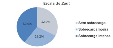 Após aplicação da escala de Zarit, verificou-se que em 39,4% dos casos o grau de sobrecarga para os cuidadores era categorizado como “intensa” e em 28,2% como “ligeira”, perfazendo um total de 67,6% dos cuidadores com sobrecarga (Fig. 3).
