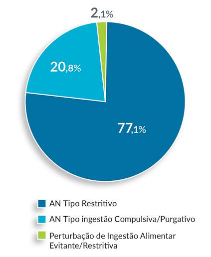 O diagnóstico principal correspondeu, na maioria dos casos (77,1%. n=37) a AN tipo restritivo, 20,8% (n=10) a AN tipo ingestão compulsiva/ purgativo e um caso a perturbação de ingestão alimentar evitante/ restritiva (Fig. 1).