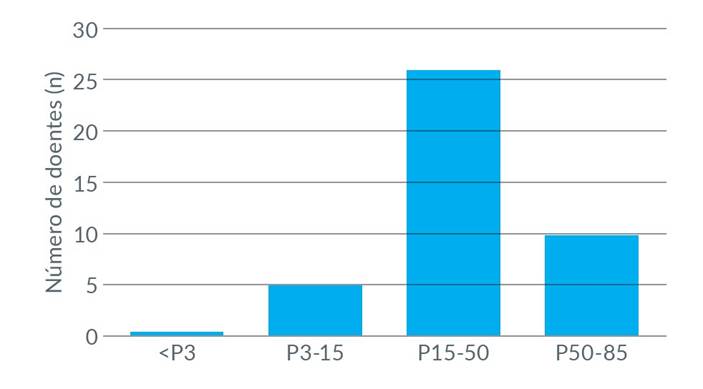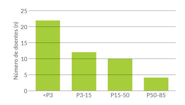 As Figuras 2 e 3 representam a evolução ponderal dos doentes durante o internamento. O IMC médio à admissão foi de 15,57 kg/m2 (considerado grave) com percentil médio de cerca de 10, tendo sido o IMC mínimo de 10,5 kg/m2 (gravidade extrema). O IMC médio de alta foi de 17,52 kg/m2 (percentil médio de cerca de 40).