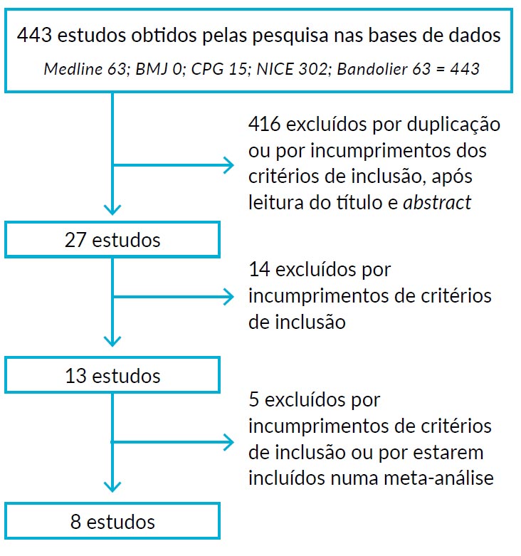 Incluíram-se, assim, um total de oito artigos: três meta-análises, duas revisões, duas guidelines e uma opinião de peritos. Os resultados encontram-se organizados nas Tabelas 1, 2 e 3.