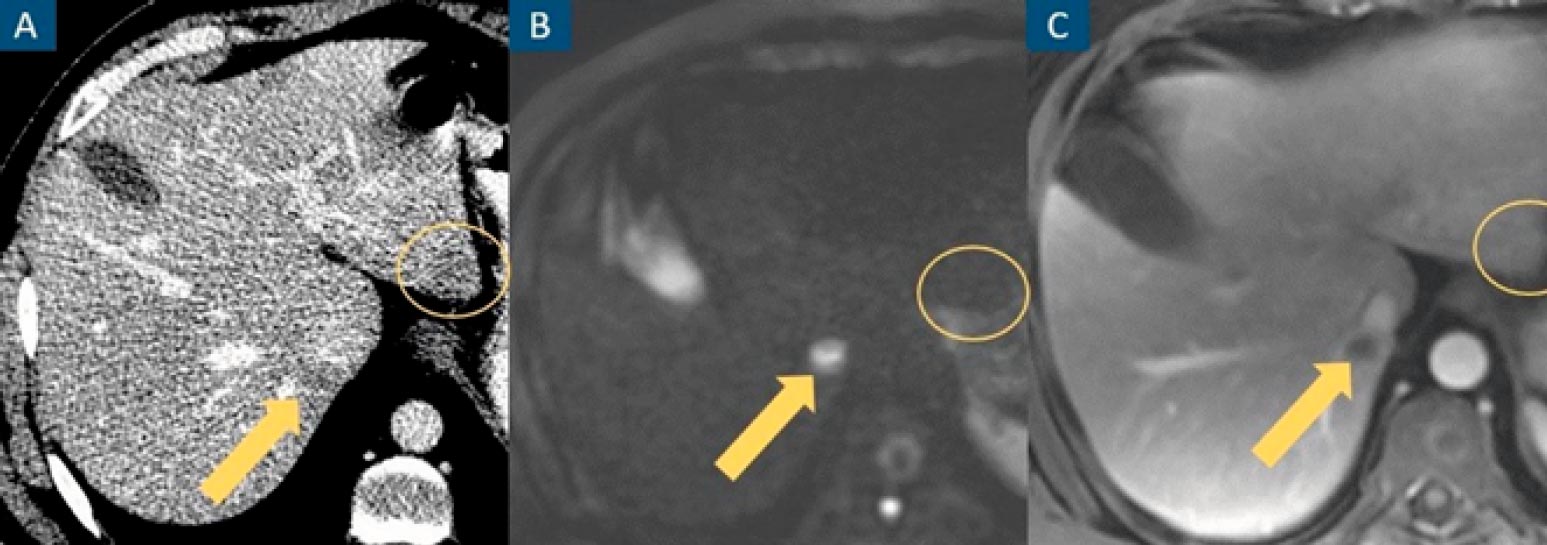Figure 1: CT misses a true hepatic lesion and detects a pseudolesion. Axial contrast-enhanced venous phase CT image (A), axial diffusion-weighted image at b=1000 (B) and axial contrast-enhanced portal venous phase fat-suppressed T1-weighted image (C). A hepatic nodule (arrow) is inconspicuous on CT and evident on MRI. An apparent hepatic nodule on CT (circle) has no expression on MRI.