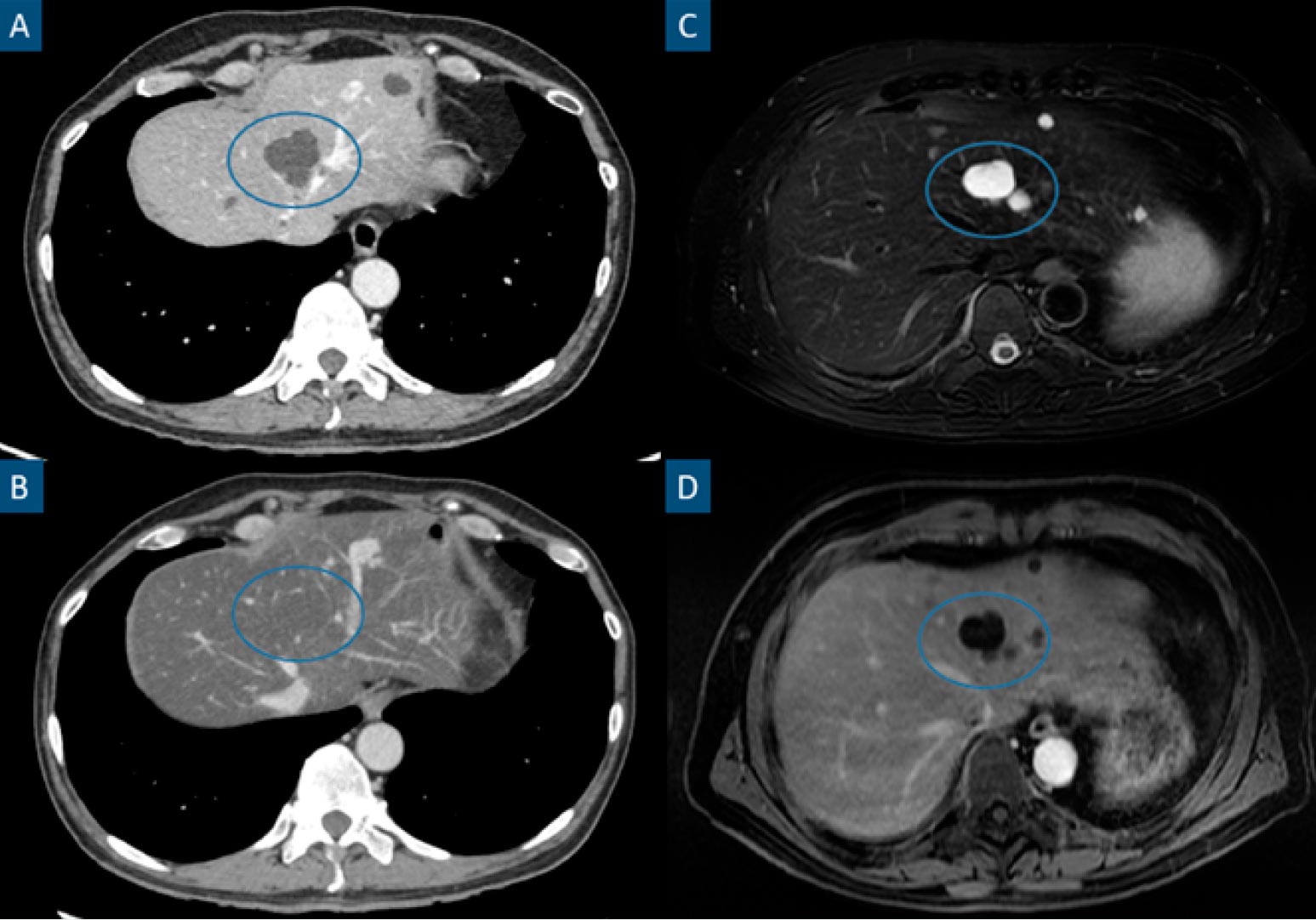Figure 2: Steatotic liver hiding previously easily identifiable hypodense hepatic lesions in CT. Axial contrast-enhanced portal phase CT images (A and B), axial fat-suppressed T2-weighted image (C) and axial contrast-enhanced portalphase T1-weighted image (D). Patient with a stage IV clear cell renal cell carcinoma. A shows a hepatic cyst (circle), characterized by a hypodense, non-enhancing and well-marginated hepatic lesion. The patient underwent a chemotherapy cycle after the previously mentioned study and B was a follow-up CT performed 6 months later. B shows a noticeably steatotic liver, characterized by a low parenchymatous density. In this setting, hypovascular lesions such as cysts or most metastatic lesions may become inconspicuous as is the case in B. MRI (C and D) easily identify these lesions (circles) in the steatotic liver as T2 hyperintense non-enhancing lesions.