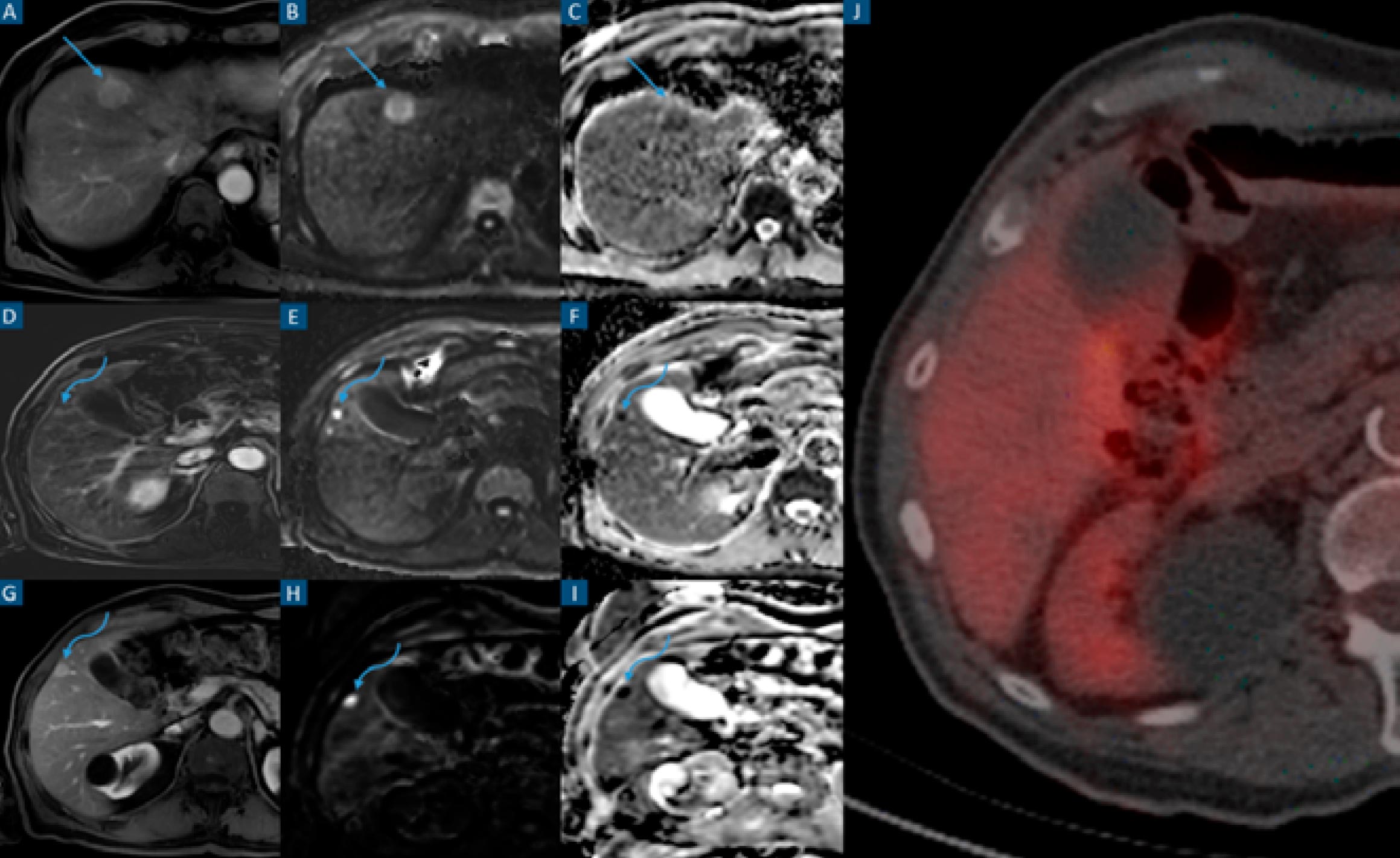 FIGURE 3: Liver metastasis undetected in intra-operatory hepatic ultrasound and PET-CT. Axial contrast-enhanced T1-weighted images on the arterial phase (A, D and G), and diffusion-weighted images at high b values (B, E and H) and ADC maps (C, F and I). Axial PET-CT with FDG (J). Patient with adenocarcinoma of the descending colon. Staging contrast-enhanced abdominal MRI was performed (A to F). A, B and C show a 20 mm highly restrictive hypervascular hepatic metastatic lesion in segment IVa (straight arrows). D, E and F show a 7 mm highly restrictive hepatic metastatic lesion in segment V (curved arrows). Intra-operatory hepatic ultrasound was performed only detecting the 20 mm lesion. Surgery consisting of a left hemicolectomy and single metastasectomy was performed. Histology revealed a metastatic adenocarcinoma lesion. Follow-up abdominal contrast-enhanced MRI performed 14 months later (G to I). G, H and I show an increase in size of the non-resected and previously described metastatic lesion in segment V (curved arrows). PET-FDG (I) acquired 3 days after the most recent MRI (G to I). No radioisotope uptake is detected in the previously mentioned lesion’s topography.